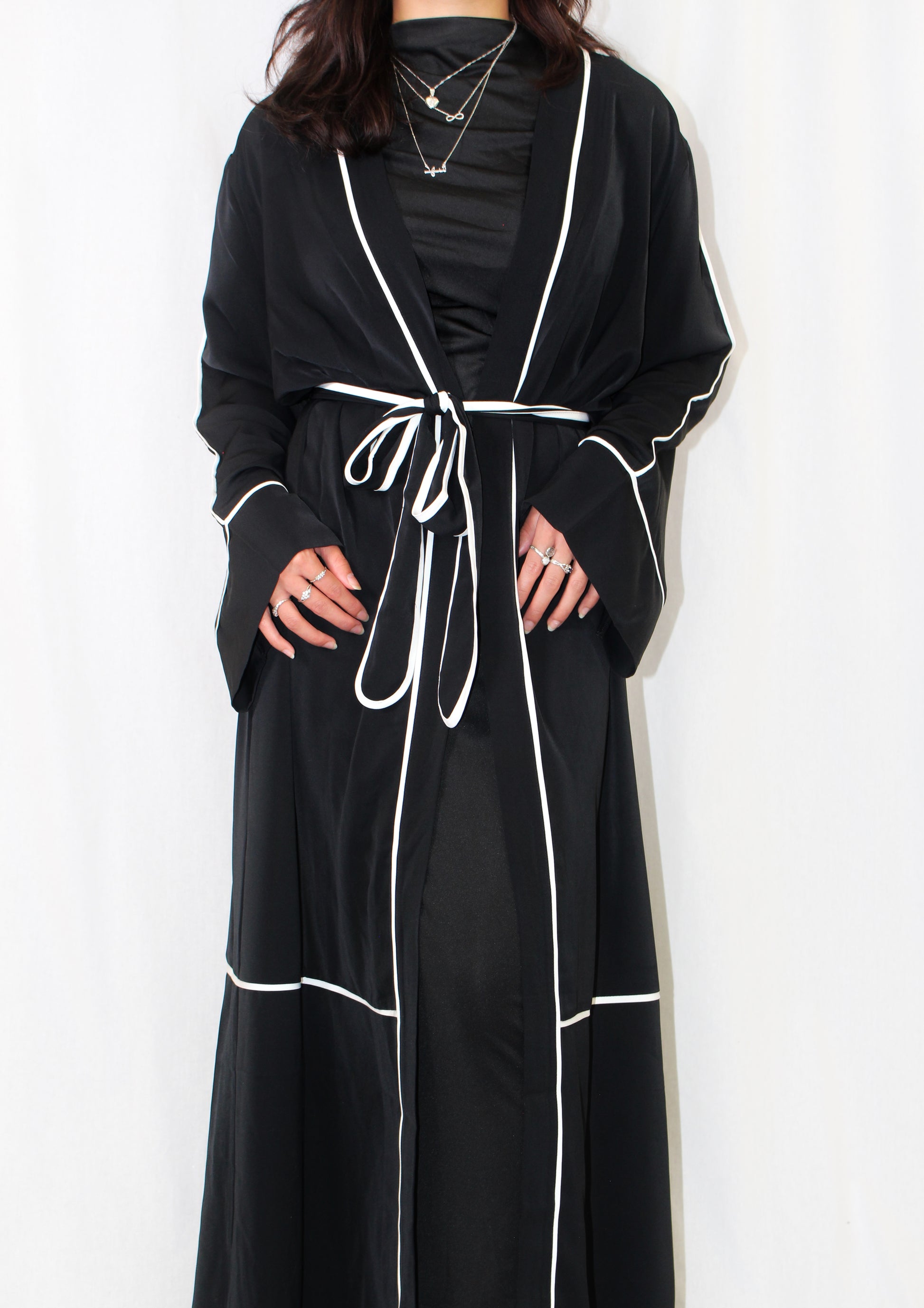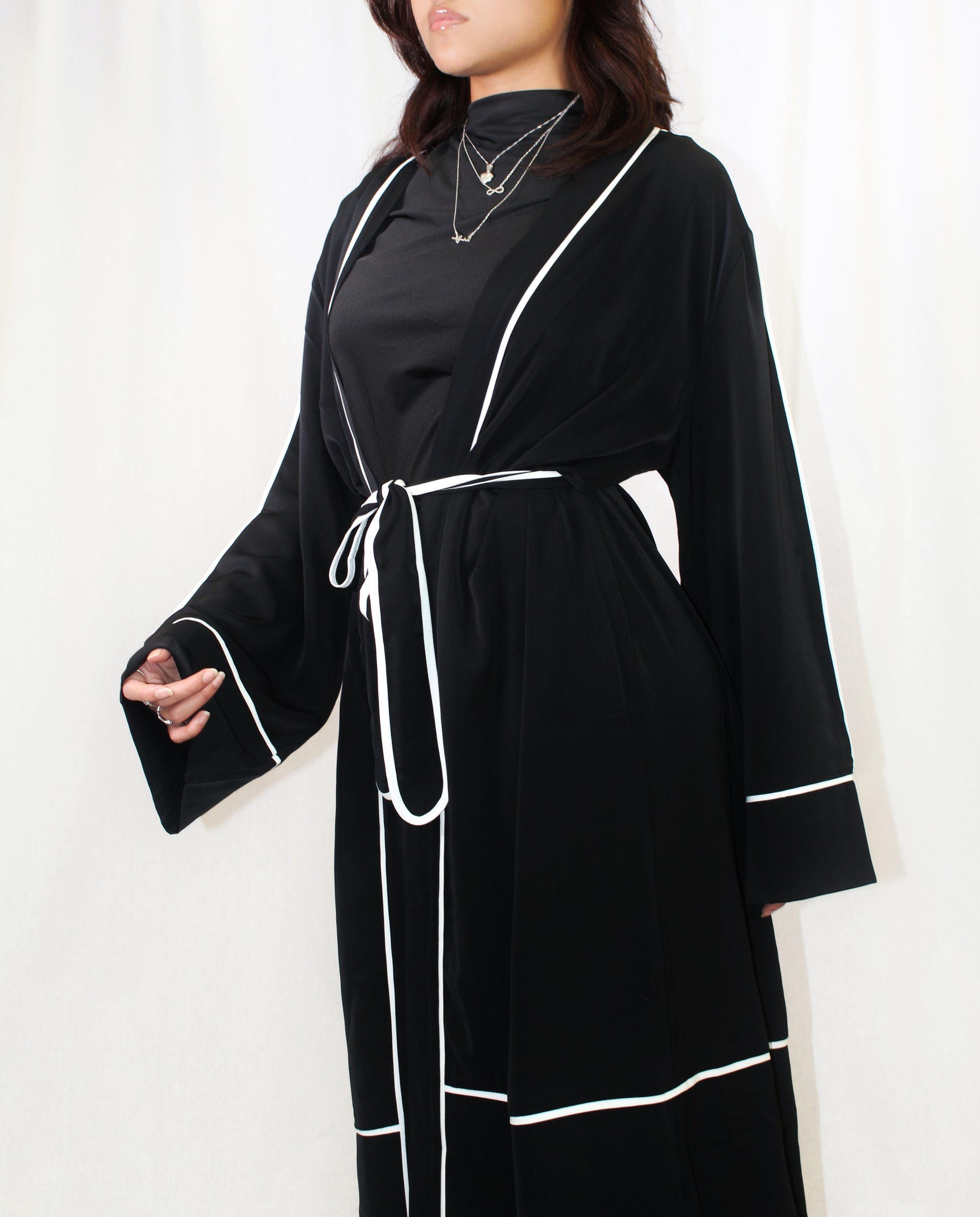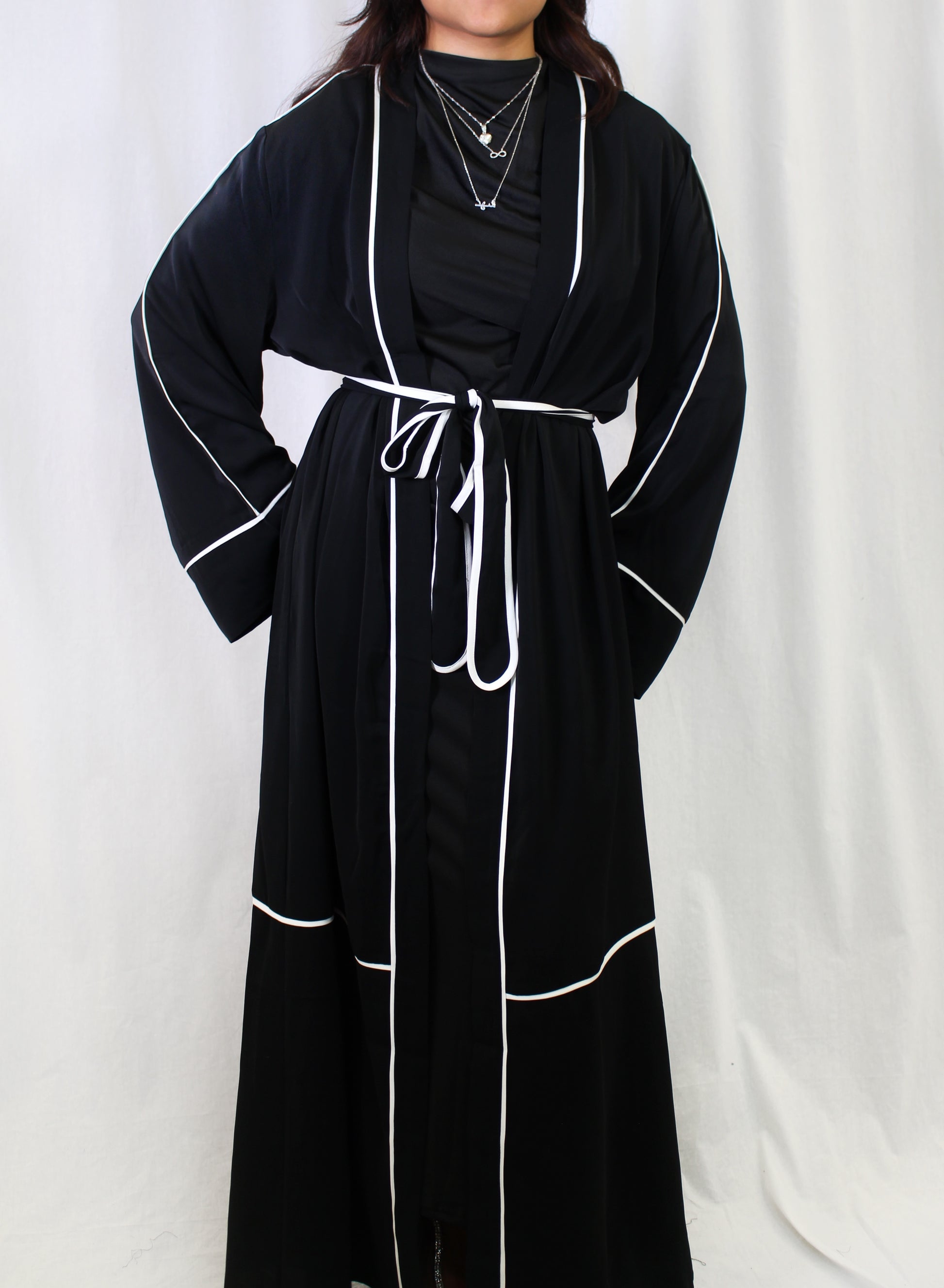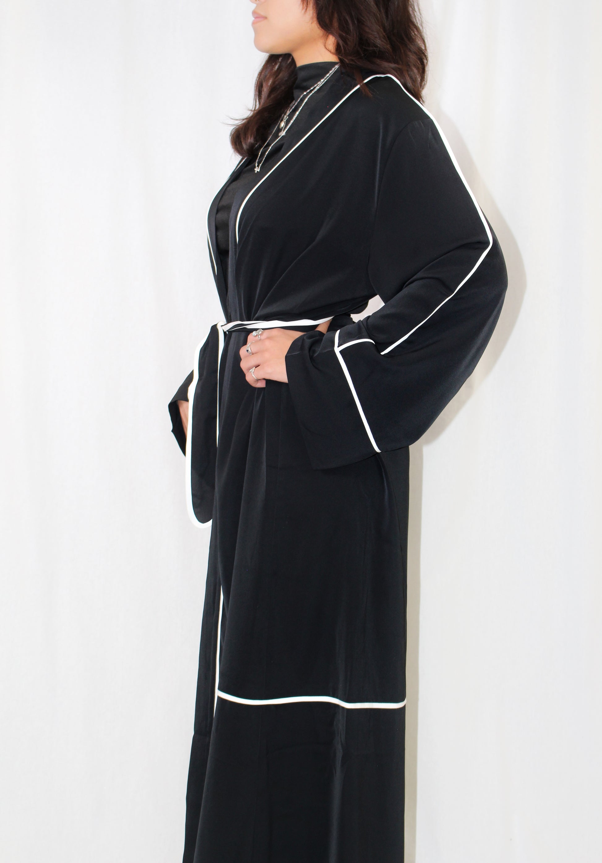 This cotton-linen abaya is the perfect choice for women seeking a versatile and elegant wardrobe staple. Crafted from a lightweight cotton-linen blend, this piece offers a flowing, open-front design that drapes effortlessly, making it ideal for layering over any outfit. The white piping detail adds a sophisticated contrast, while the wide sleeves ensure comfort and ease of movement with a touch of refinement.